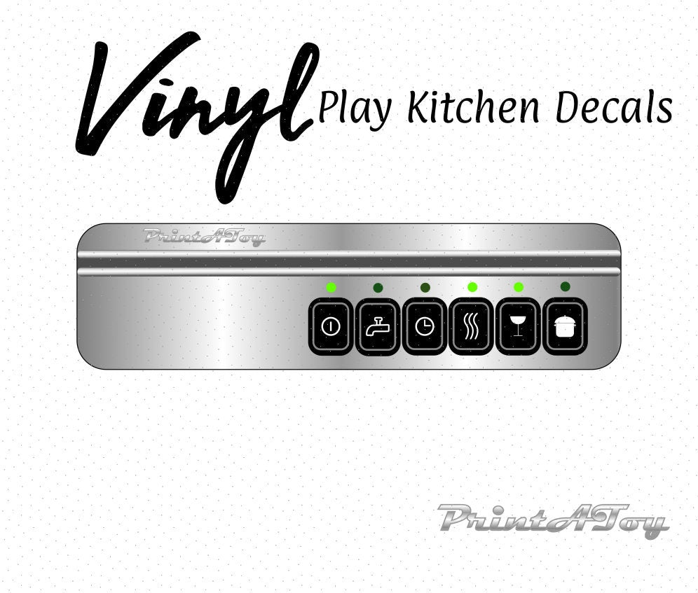 The Print A Toy Kitchen Decal Series Includes a complete variety of playhouse appliances including stove bundle with oven, broiler, vintage looking gas range, Electric cooktop, refrigerator set with Freezer door shelf, fridge door shelves and drawers, and Ice water dispenser, dishwasher, sink, Gas or electric grill, Laundry kit with washing machine, clothes dryer and related knobs, bobs, buttons, dials keypads panels racks and accessories. Everything you need for a custom and unique little kitchenette.